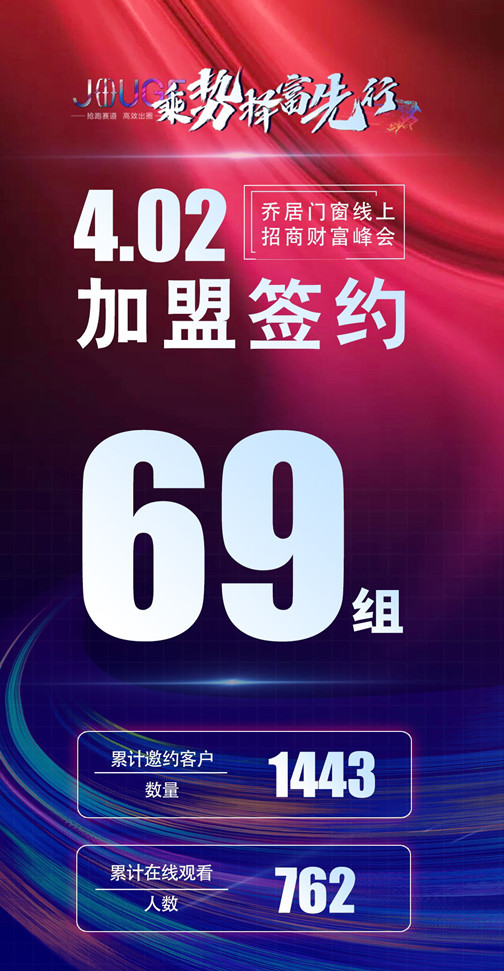 2023年4月2日,喬居門窗成功舉辦首屆線上招商財(cái)富論壇,以“乘勢(shì) 擇富 先行”為主題,吸引了全國(guó)各地千余名建材家居經(jīng)銷企業(yè)參與。在這場(chǎng)招商會(huì)上,喬居展現(xiàn)了卓越的品牌實(shí)力和產(chǎn)品魅力,一舉拿下69組簽約加盟,共同與各經(jīng)銷商探討財(cái)富增長(zhǎng)的路徑,共筑美好未來。